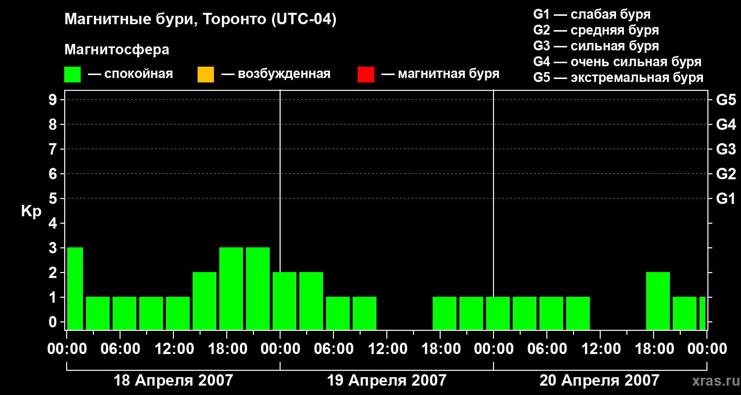 Изменения геомагнитного индекса Kp с 18 по 20 апреля 2007 года для средних широт
