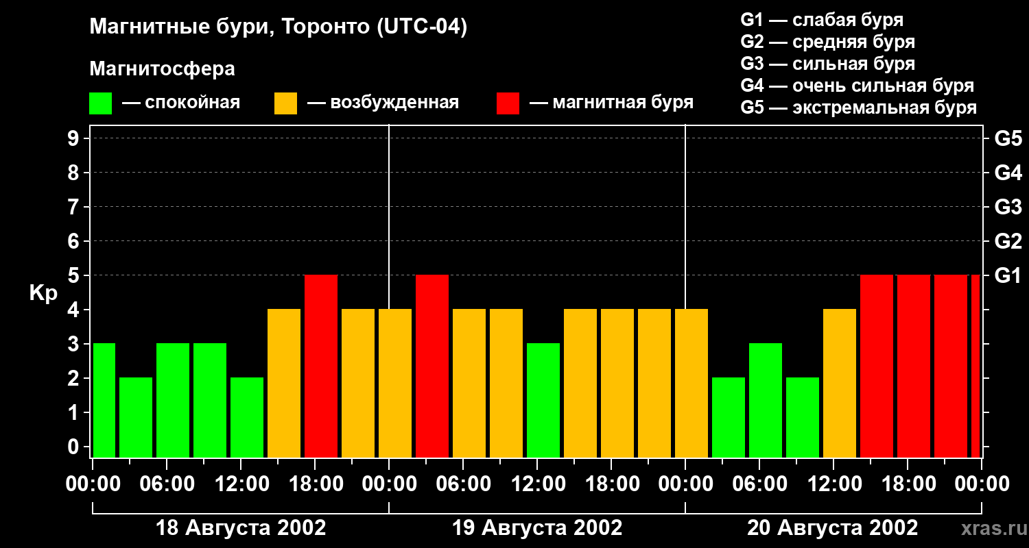 Изменения геомагнитного индекса Kp с 18 по 20 августа 2002 года для средних широт