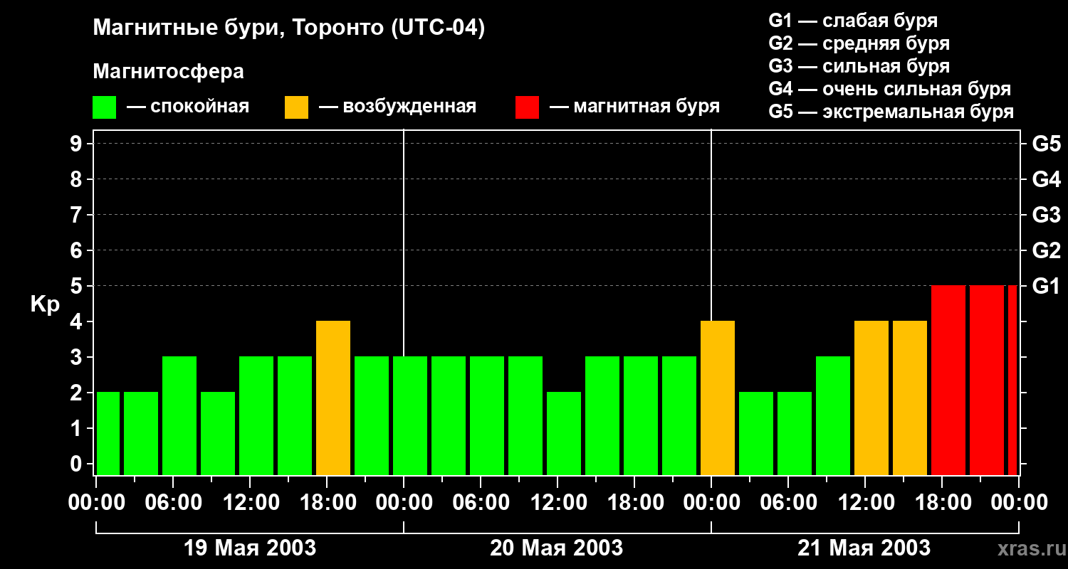Изменения геомагнитного индекса Kp с 19 по 21 мая 2003 года для средних широт
