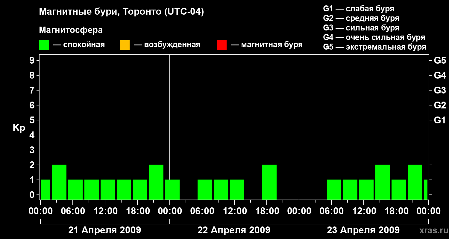 Изменения геомагнитного индекса Kp с 21 по 23 апреля 2009 года для средних широт