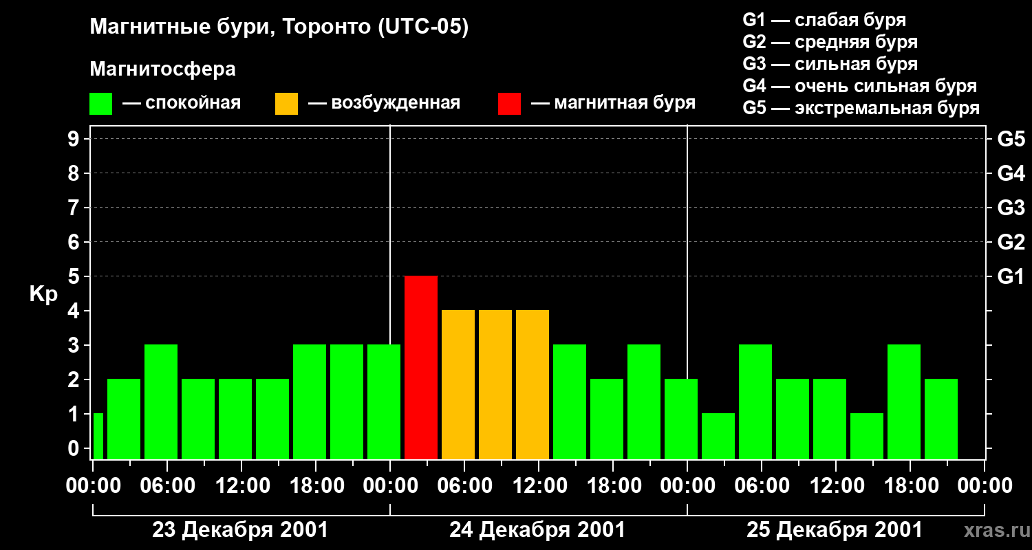 Изменения геомагнитного индекса Kp с 23 по 25 декабря 2001 года для средних широт