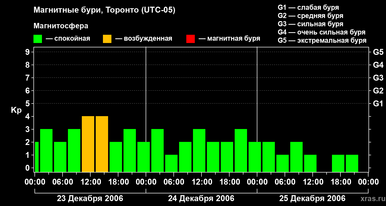 Изменения геомагнитного индекса Kp с 23 по 25 декабря 2006 года для средних широт