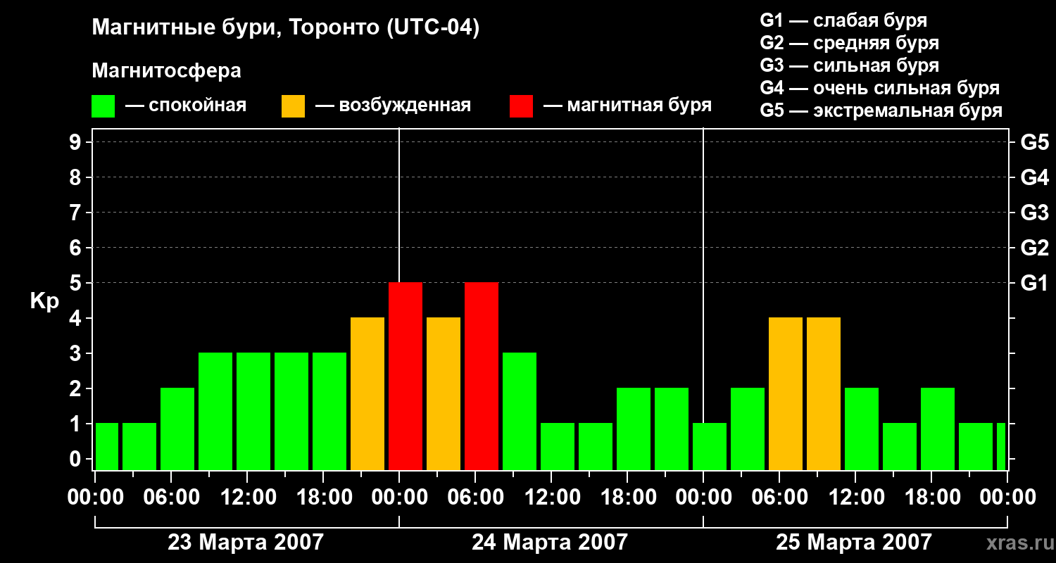 Изменения геомагнитного индекса Kp с 23 по 25 марта 2007 года для средних широт