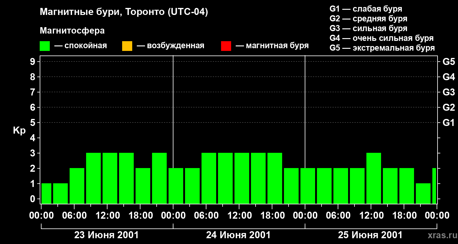 Изменения геомагнитного индекса Kp с 23 по 25 июня 2001 года для средних широт