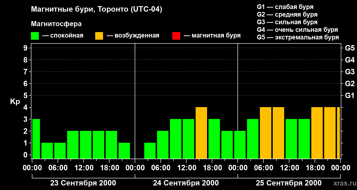 Изменения геомагнитного индекса Kp с 23 по 25 сентября 2000 года для средних широт