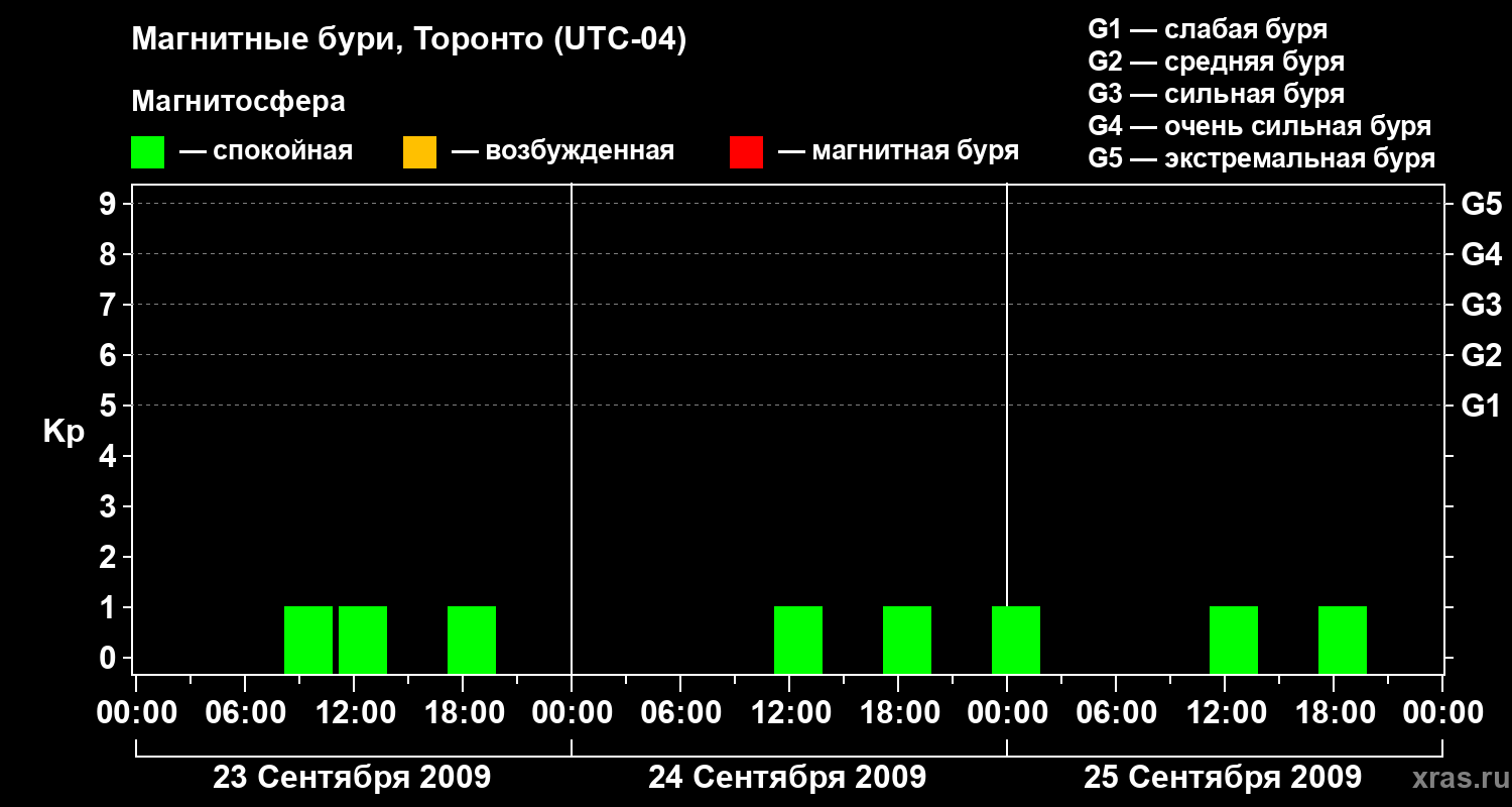 Изменения геомагнитного индекса Kp с 23 по 25 сентября 2009 года для средних широт