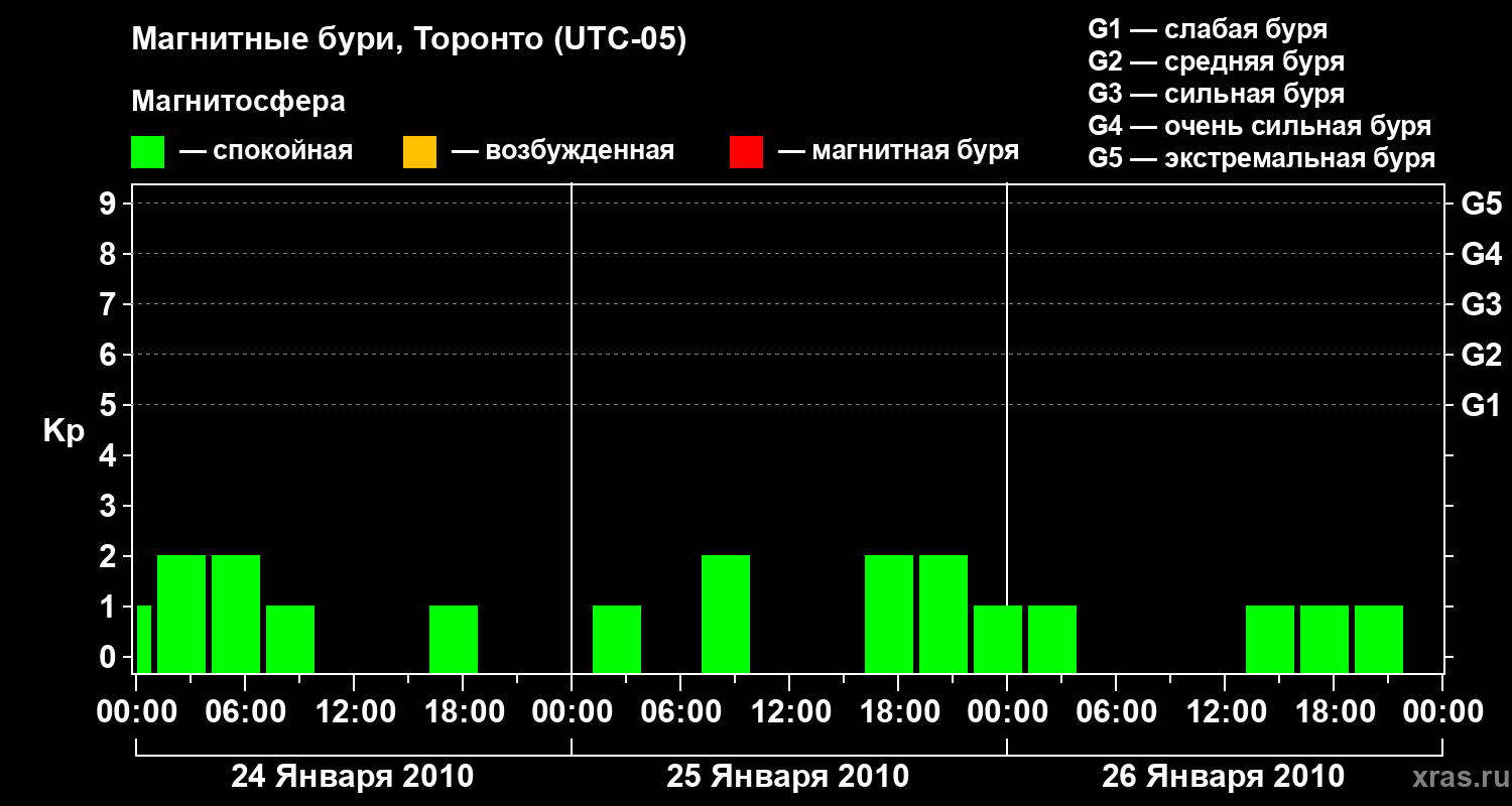 Изменения геомагнитного индекса Kp с 24 по 26 января 2010 года для средних широт