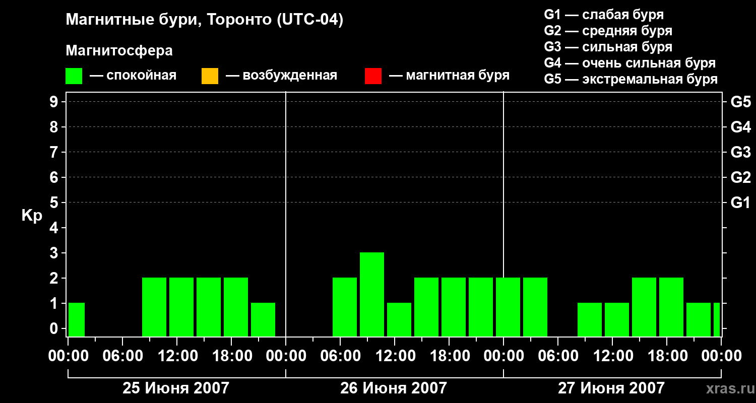 Изменения геомагнитного индекса Kp с 25 по 27 июня 2007 года для средних широт
