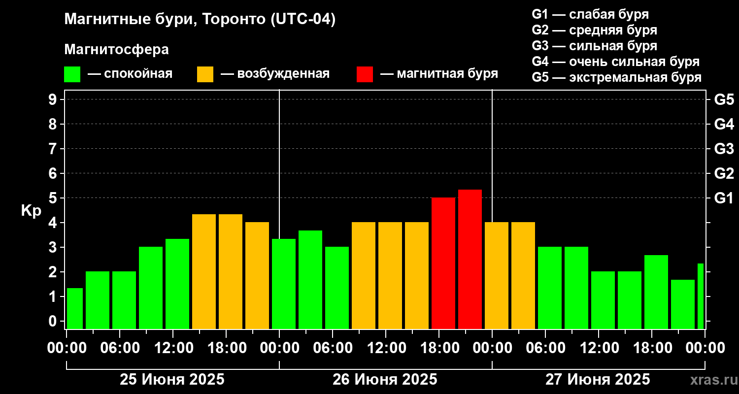 Изменения геомагнитного индекса Kp с 25 по 27 июня 2025 года для средних широт