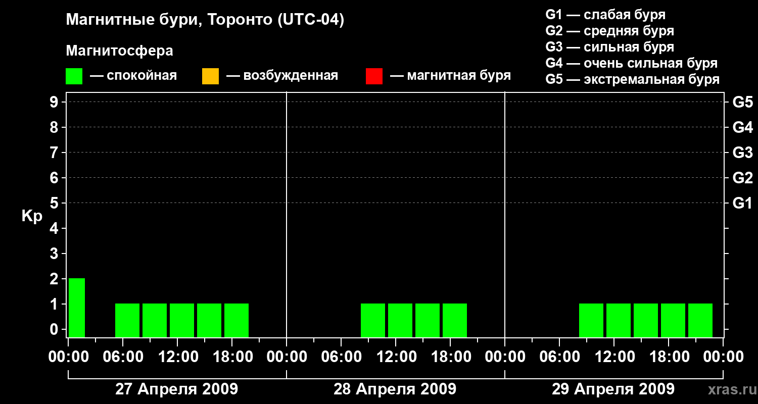 Изменения геомагнитного индекса Kp с 27 по 29 апреля 2009 года для средних широт