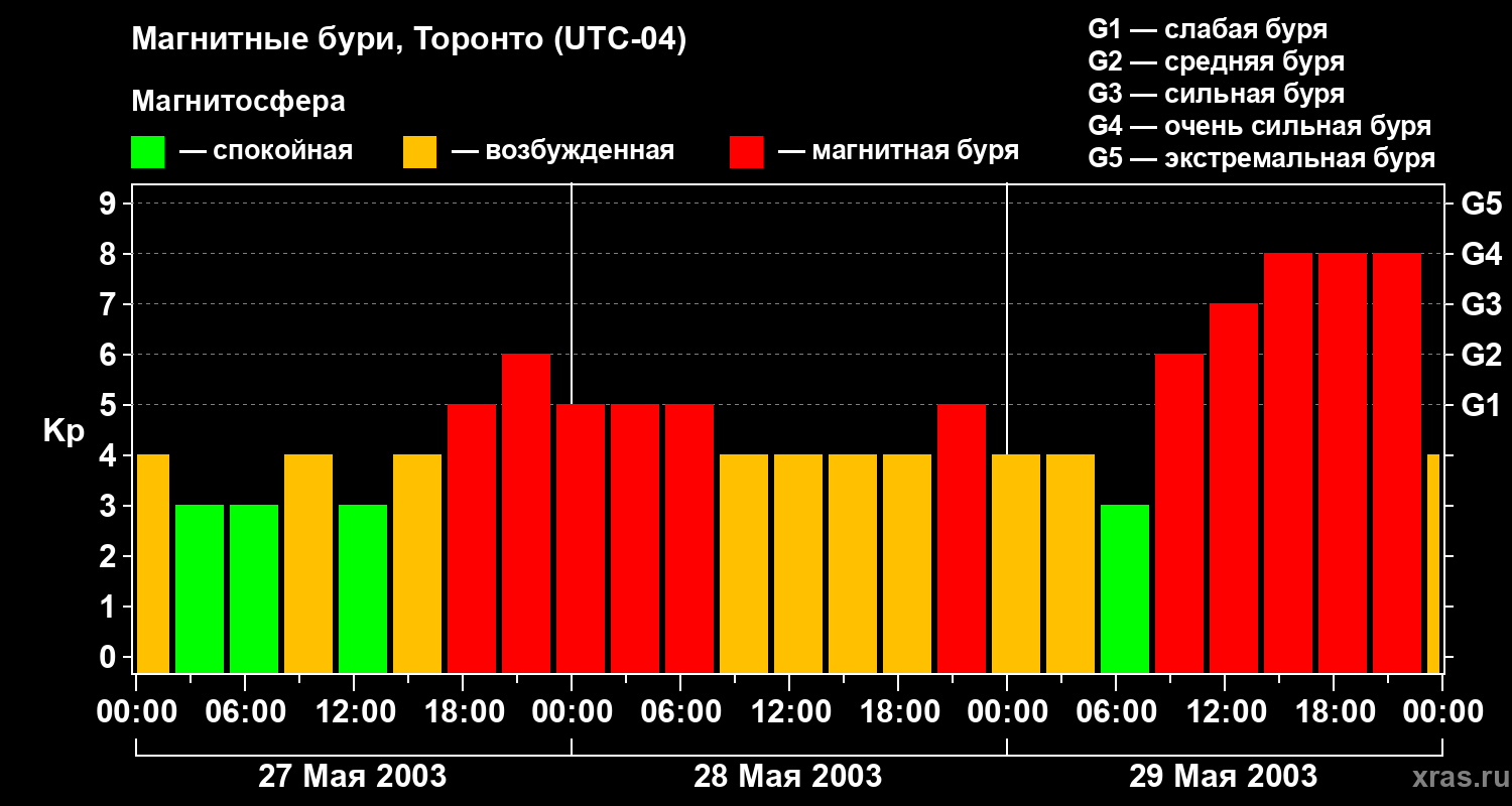 Изменения геомагнитного индекса Kp с 27 по 29 мая 2003 года для средних широт