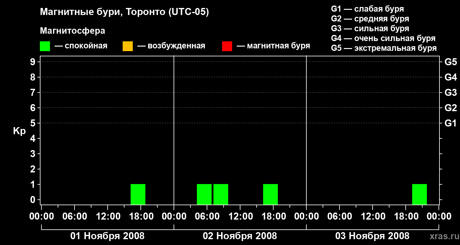 Изменения геомагнитного индекса Kp с 1 по 3 ноября 2008 года для средних широт