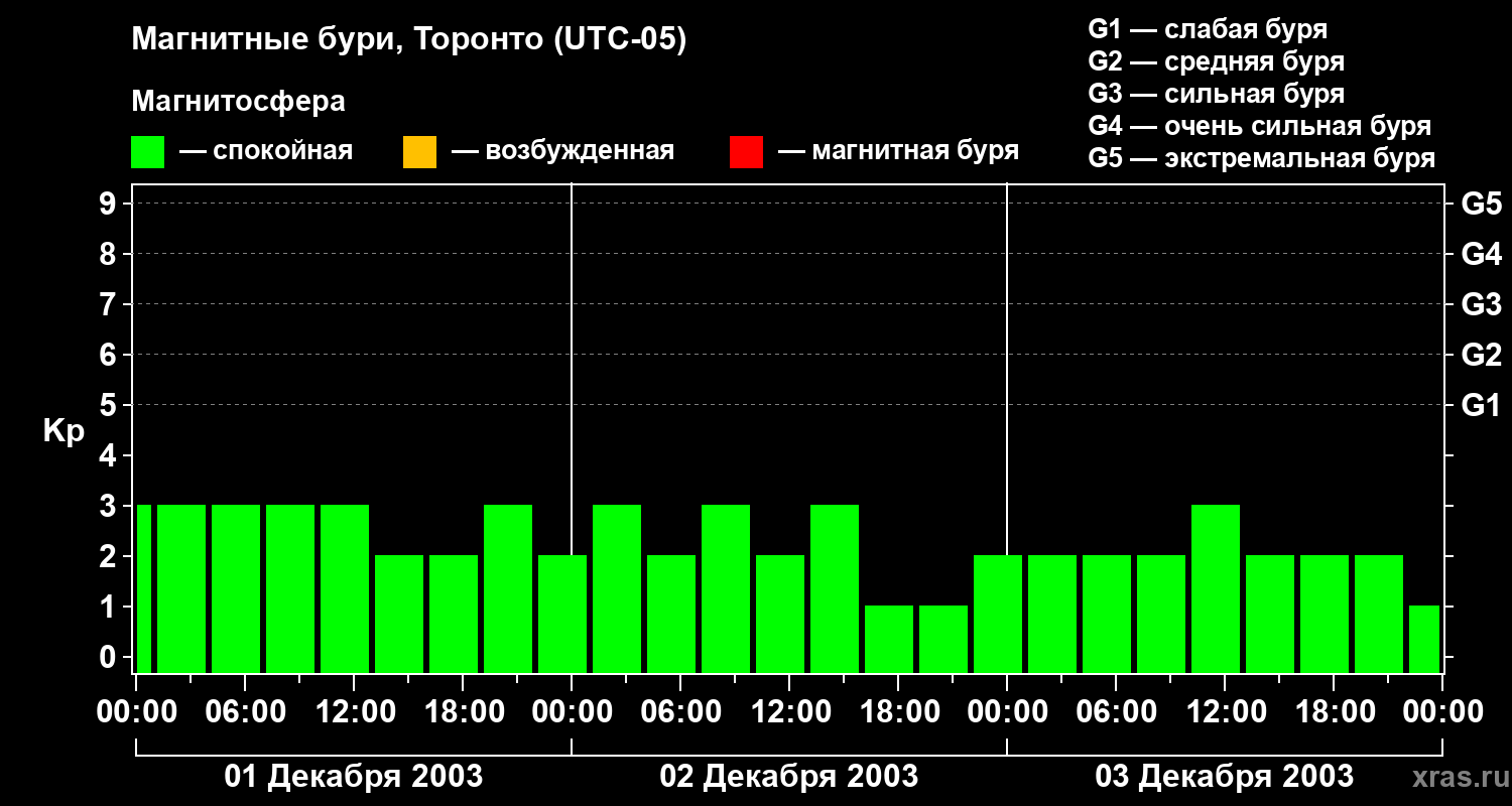Изменения геомагнитного индекса Kp с 1 по 3 декабря 2003 года для средних широт