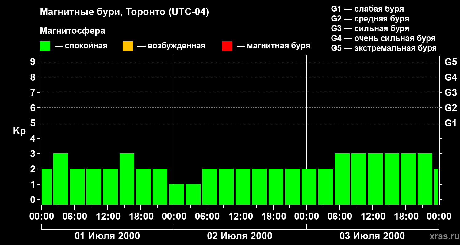 Изменения геомагнитного индекса Kp с 1 по 3 июля 2000 года для средних широт