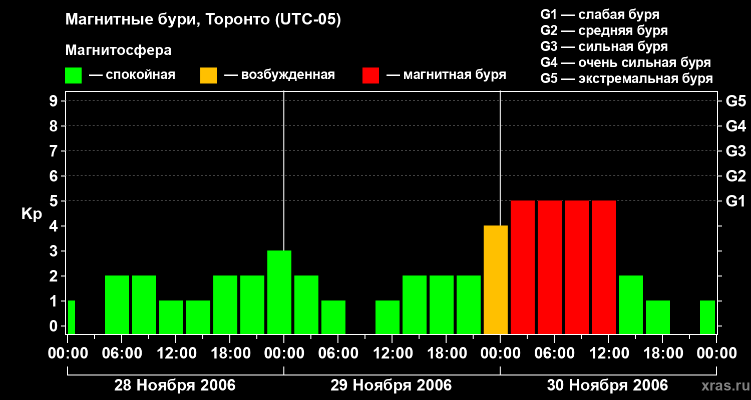 Изменения геомагнитного индекса Kp с 28 по 30 ноября 2006 года для средних широт