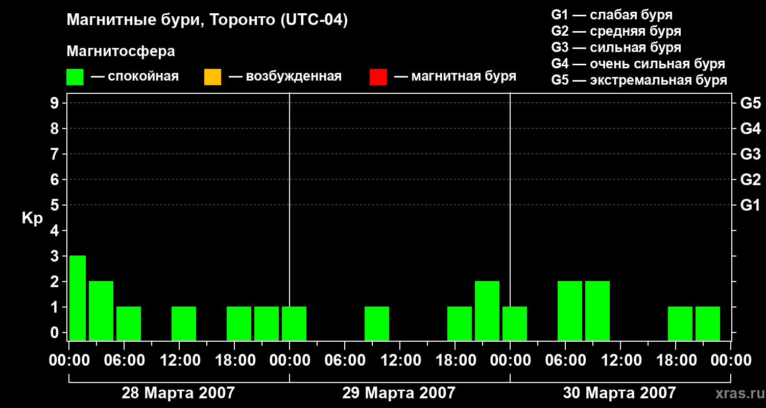 Изменения геомагнитного индекса Kp с 28 по 30 марта 2007 года для средних широт