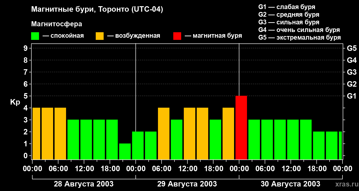 Изменения геомагнитного индекса Kp с 28 по 30 августа 2003 года для средних широт