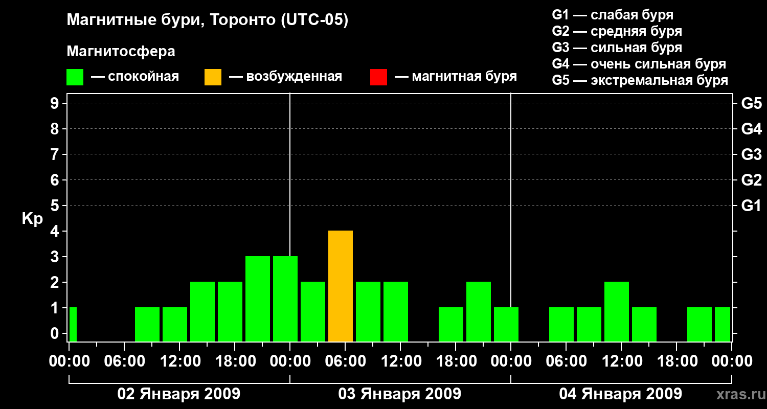 Изменения геомагнитного индекса Kp с 2 по 4 января 2009 года для средних широт
