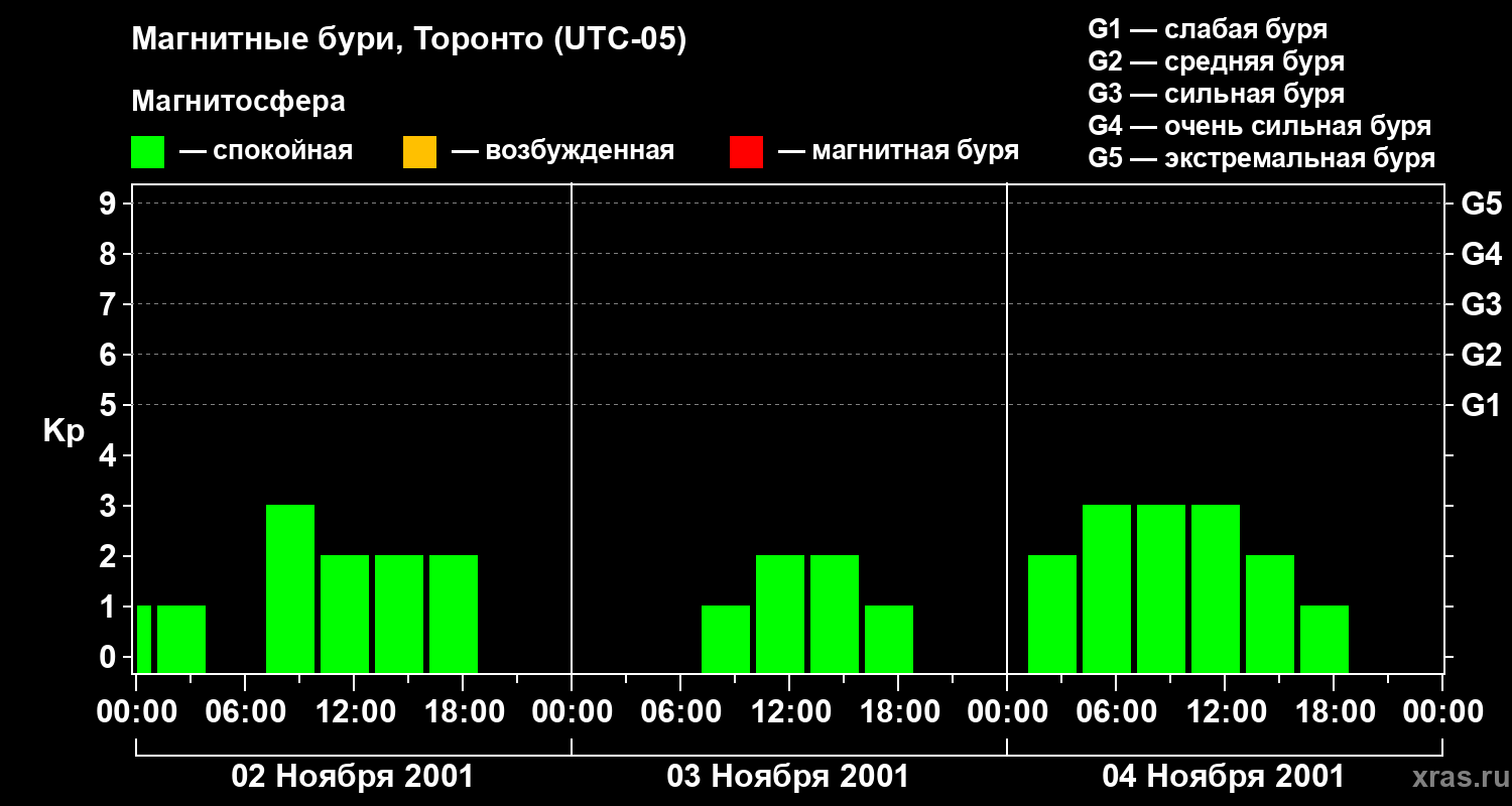 Изменения геомагнитного индекса Kp с 2 по 4 ноября 2001 года для средних широт