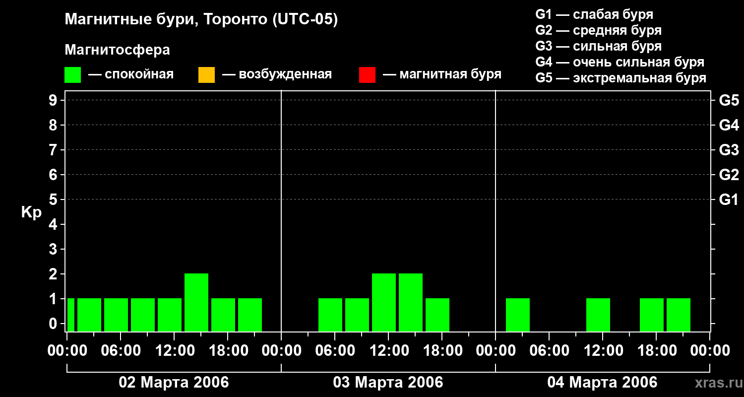 Изменения геомагнитного индекса Kp с 2 по 4 марта 2006 года для средних широт