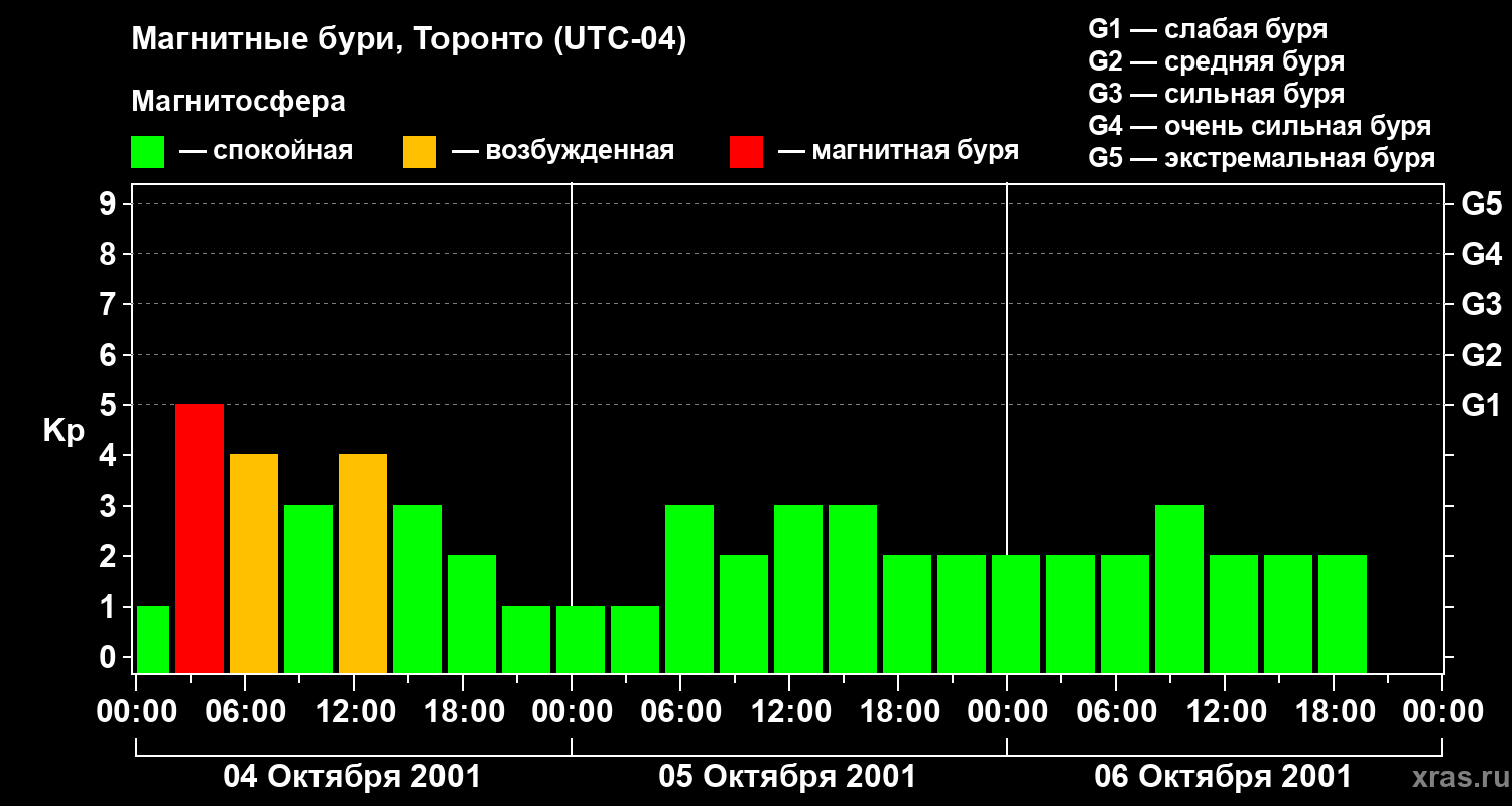 Изменения геомагнитного индекса Kp с 4 по 6 октября 2001 года для средних широт