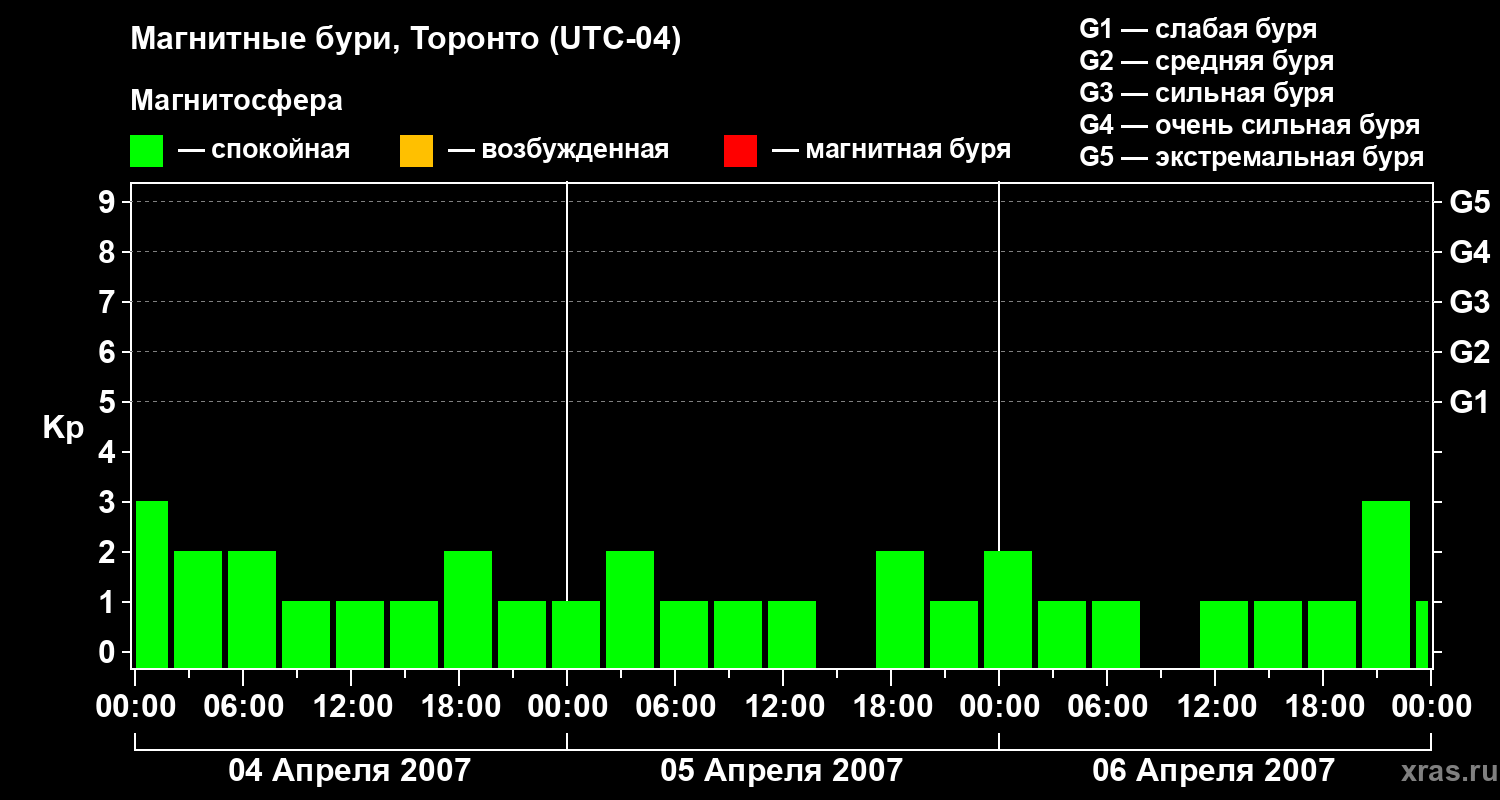 Изменения геомагнитного индекса Kp с 4 по 6 апреля 2007 года для средних широт