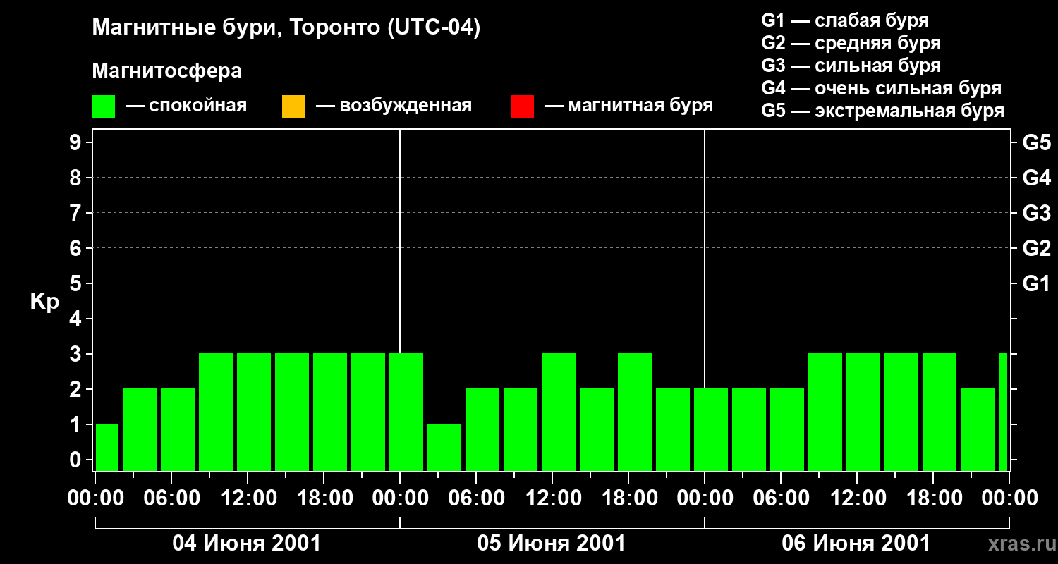 Изменения геомагнитного индекса Kp с 4 по 6 июня 2001 года для средних широт