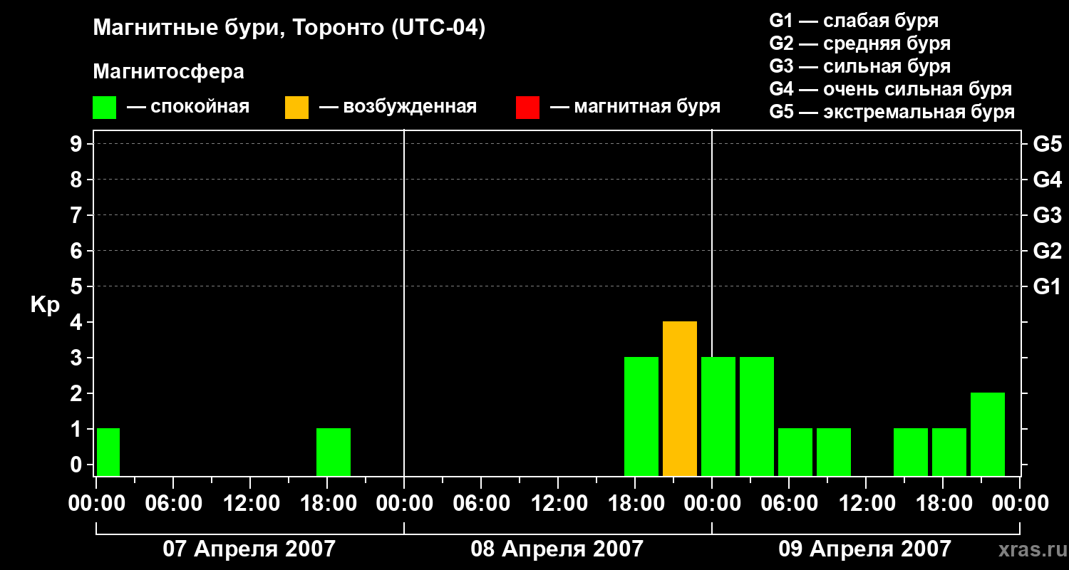 Изменения геомагнитного индекса Kp с 7 по 9 апреля 2007 года для средних широт