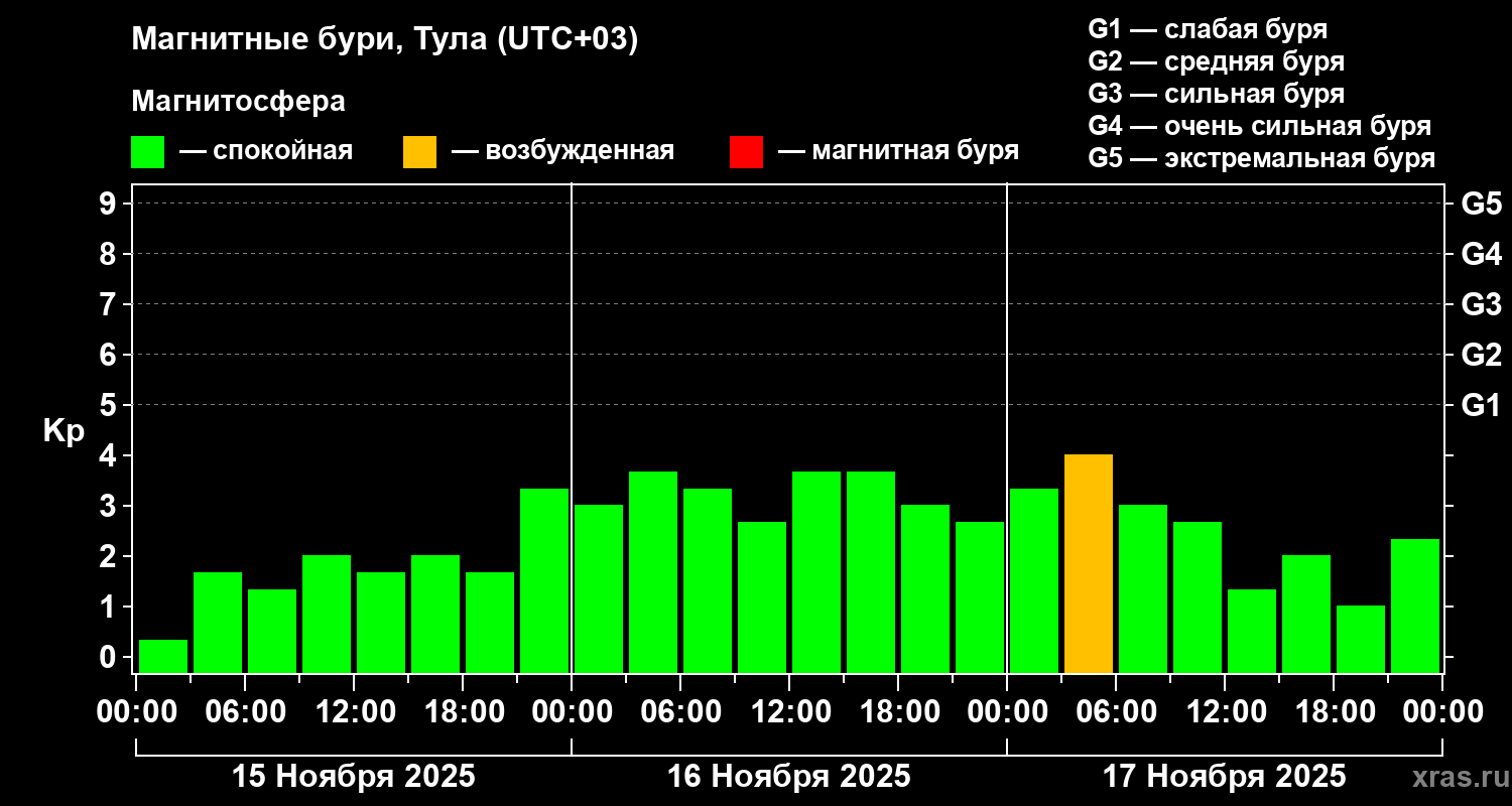 Изменения геомагнитного индекса Kp с 15 по 17 ноября 2025 года для средних широт