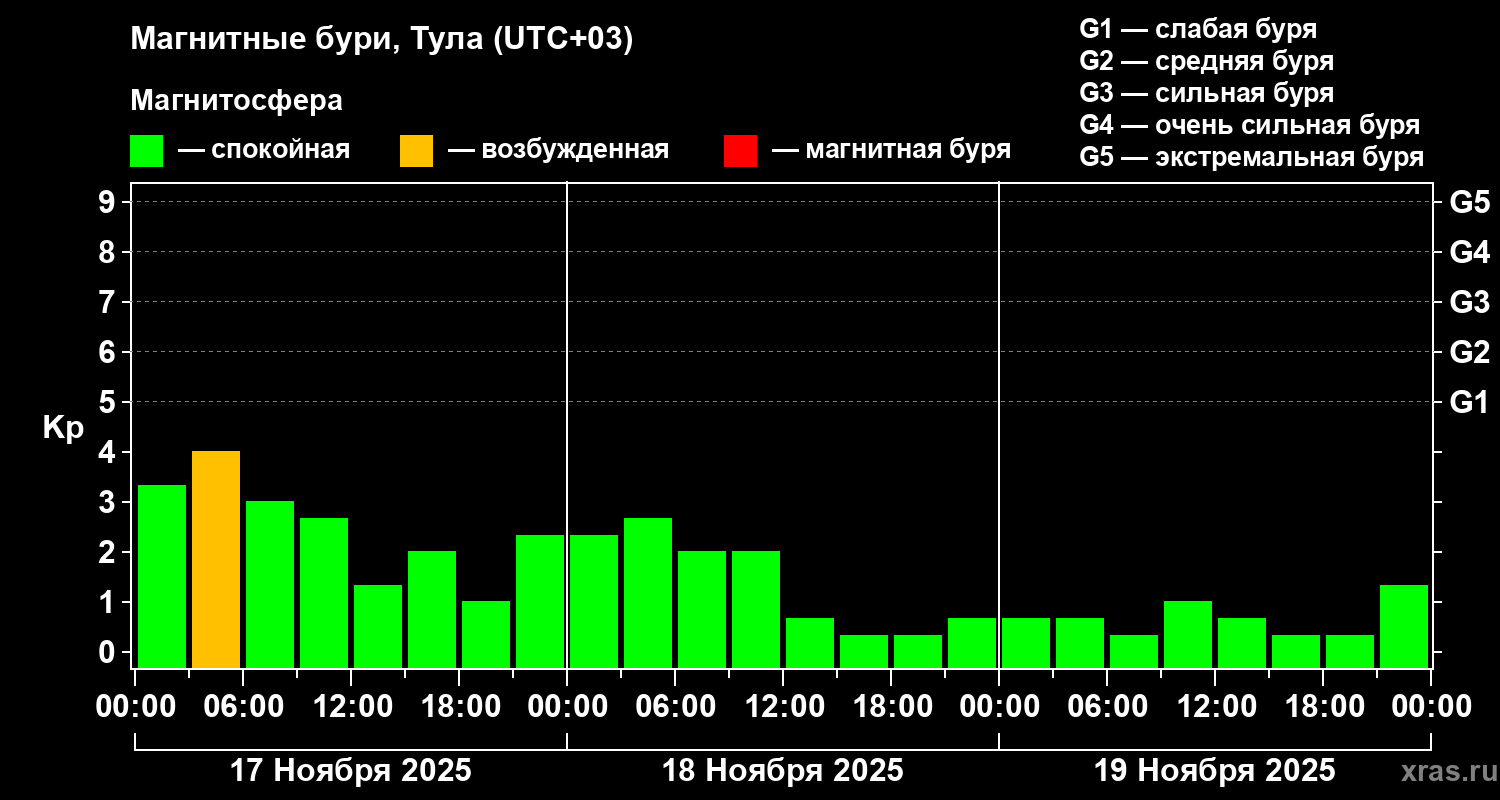 Изменения геомагнитного индекса Kp с 17 по 19 ноября 2025 года для средних широт