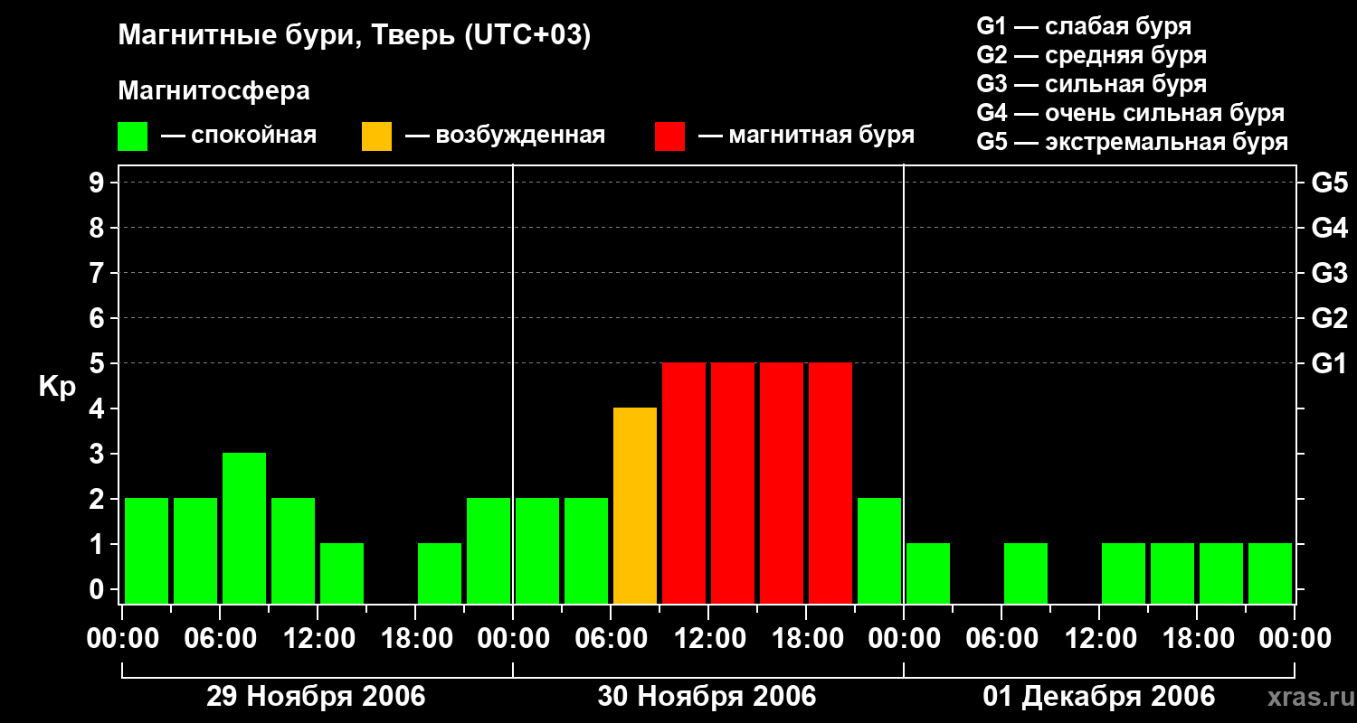 Изменения геомагнитного индекса Kp с 29 ноября по 1 декабря 2006 года для средних широт