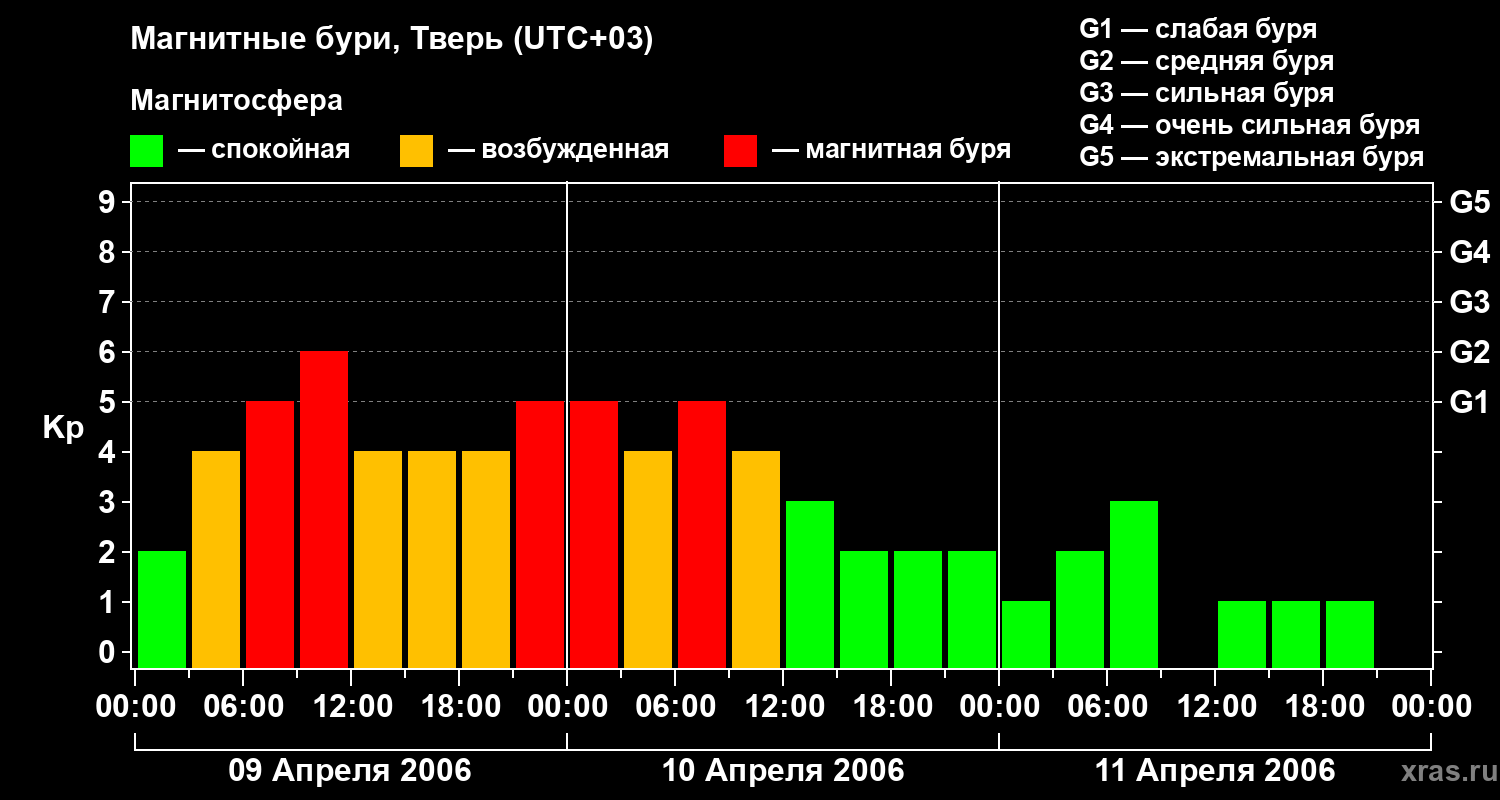 Изменения геомагнитного индекса Kp с 9 по 11 апреля 2006 года для средних широт