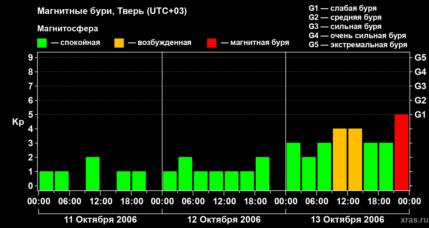 Изменения геомагнитного индекса Kp с 11 по 13 октября 2006 года для средних широт