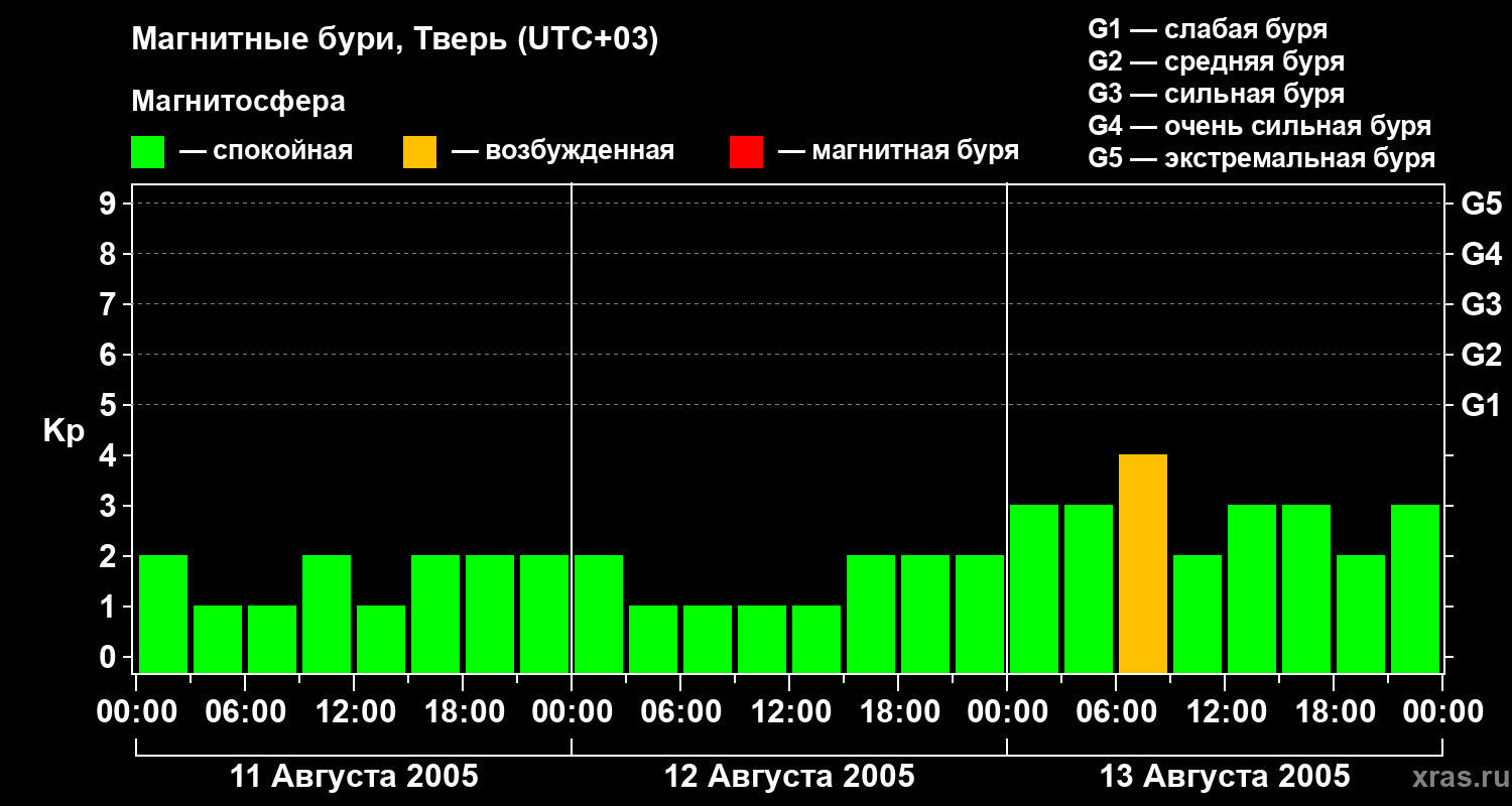 Изменения геомагнитного индекса Kp с 11 по 13 августа 2005 года для средних широт