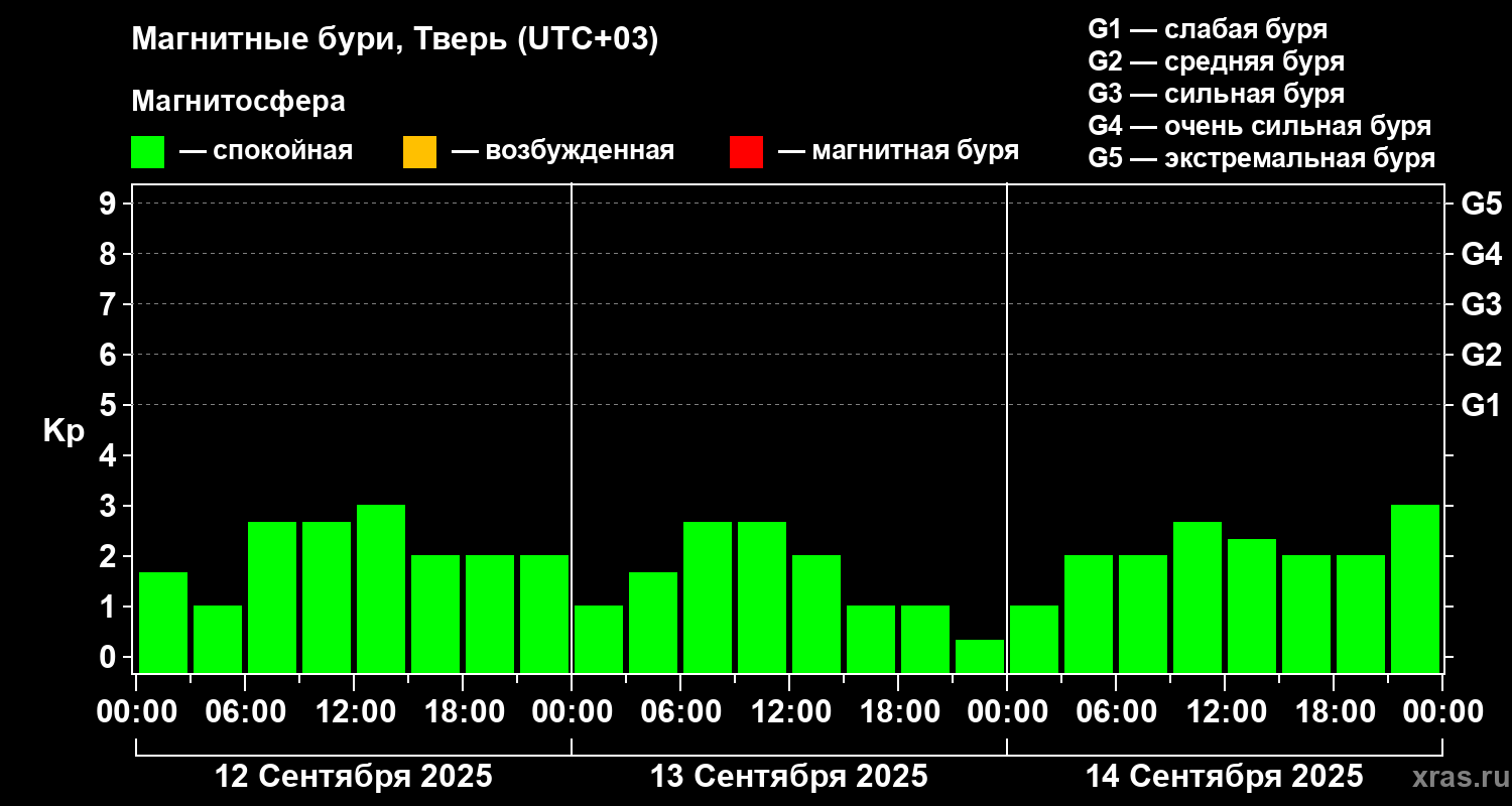 Изменения геомагнитного индекса Kp с 12 по 14 сентября 2025 года для средних широт