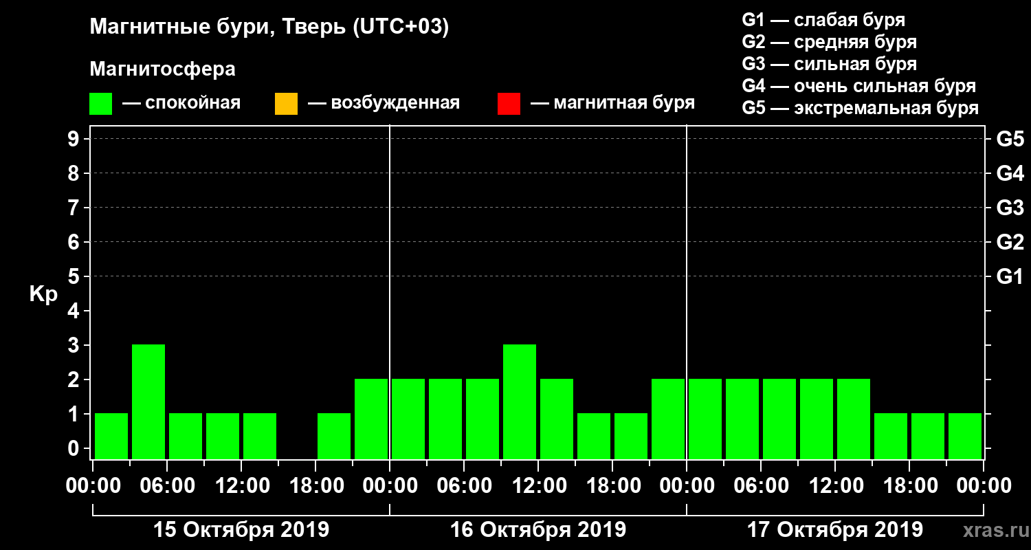 Изменения геомагнитного индекса Kp с 15 по 17 октября 2019 года для средних широт