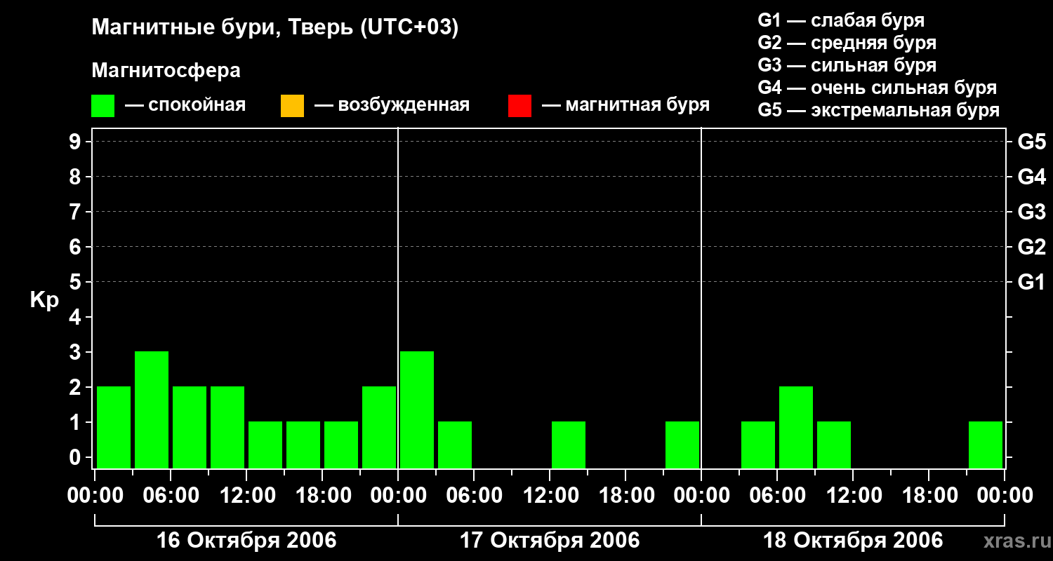 Изменения геомагнитного индекса Kp с 16 по 18 октября 2006 года для средних широт