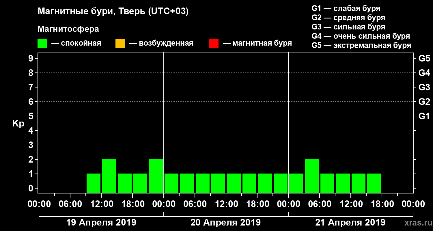Изменения геомагнитного индекса Kp с 19 по 21 апреля 2019 года для средних широт