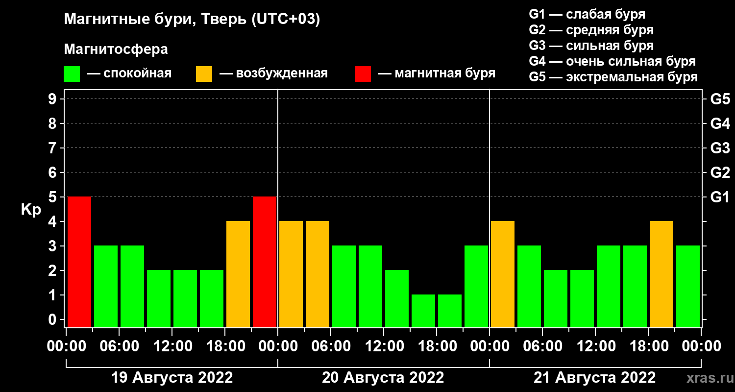 Изменения геомагнитного индекса Kp с 19 по 21 августа 2022 года для средних широт