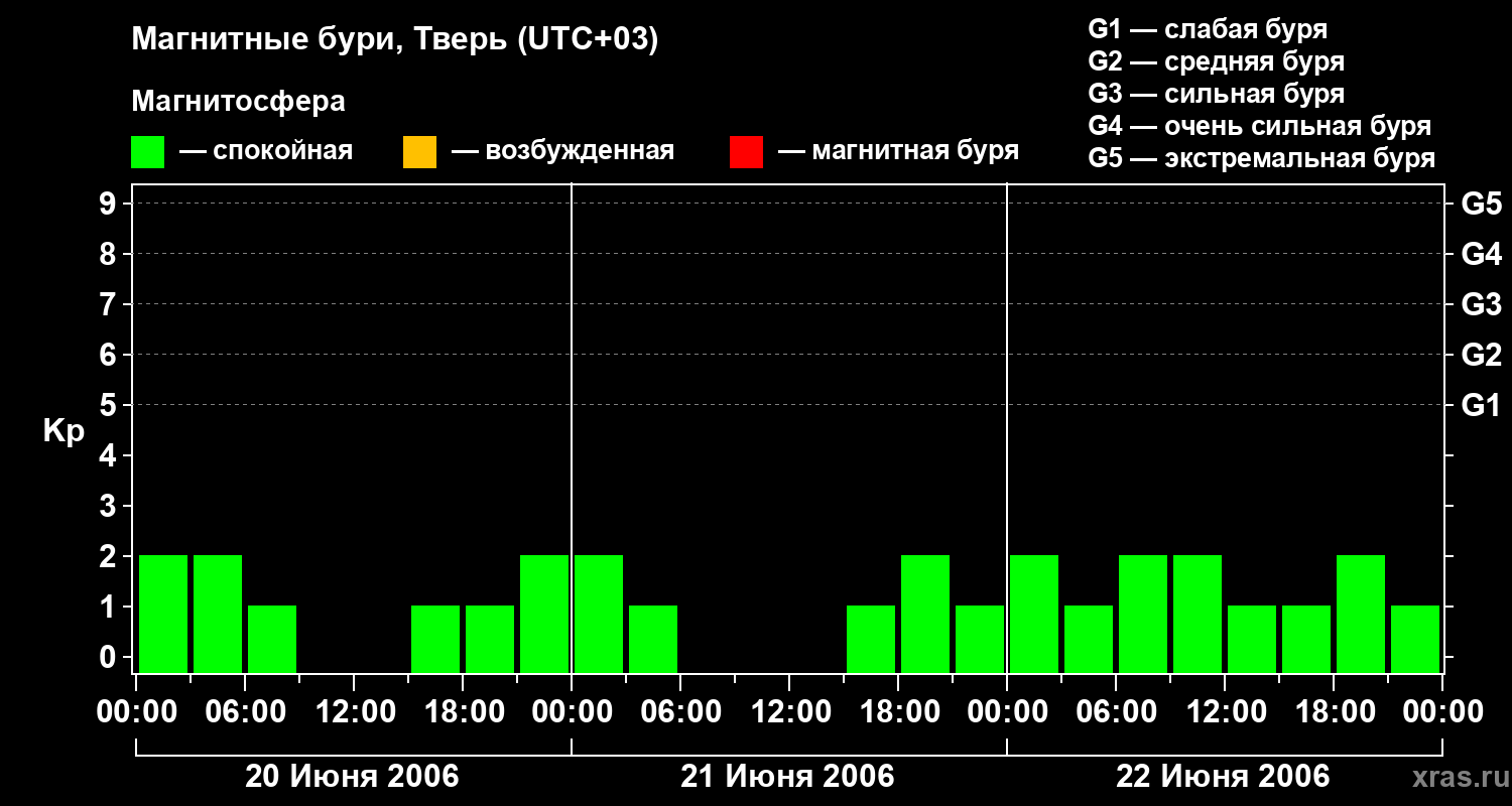 Изменения геомагнитного индекса Kp с 20 по 22 июня 2006 года для средних широт