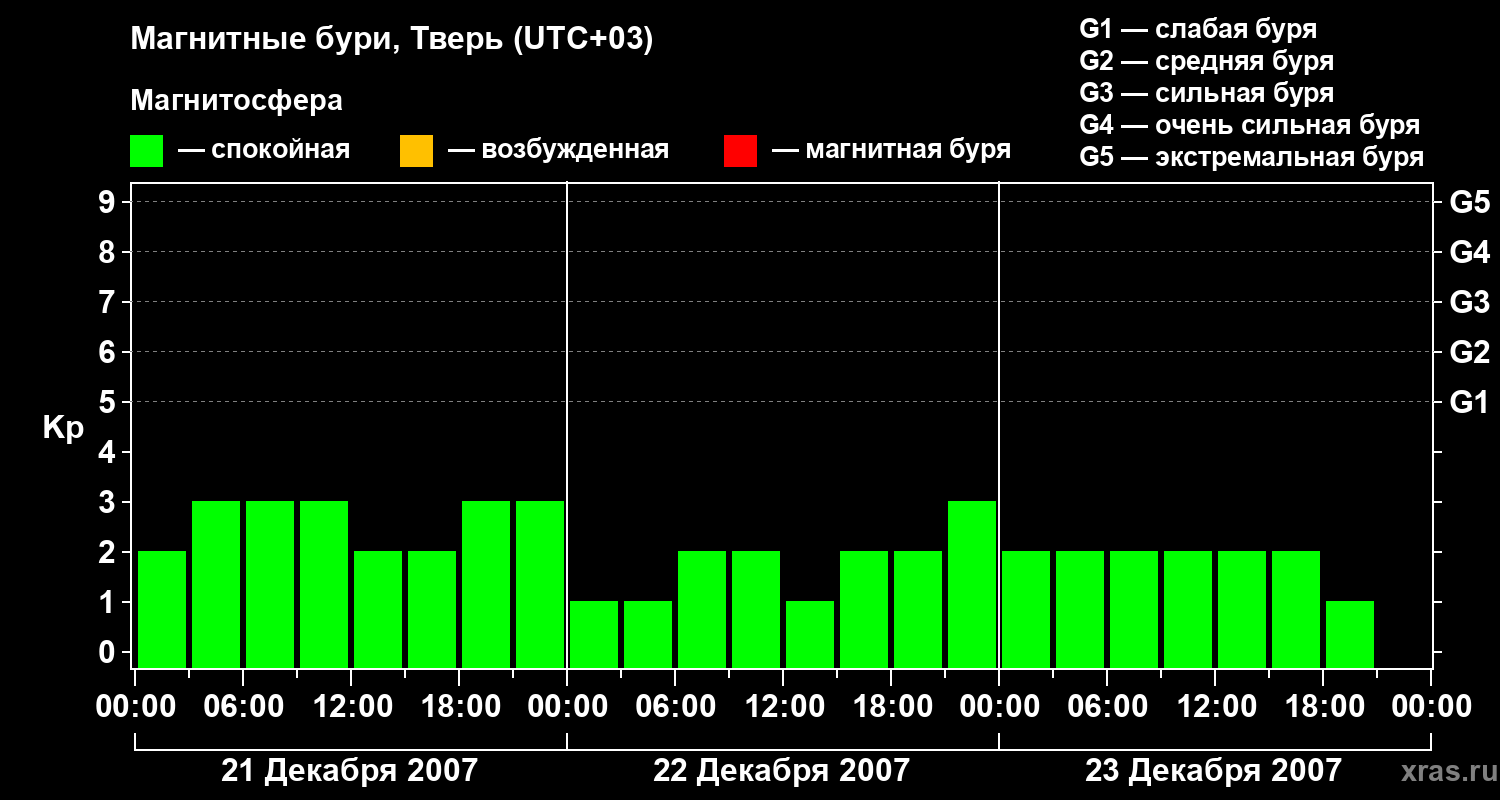 Изменения геомагнитного индекса Kp с 21 по 23 декабря 2007 года для средних широт