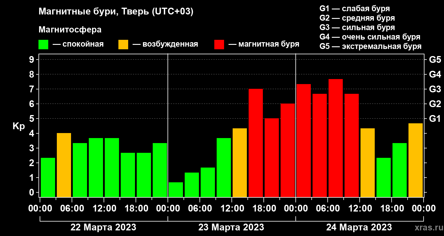 Изменения геомагнитного индекса Kp с 22 по 24 марта 2023 года для средних широт