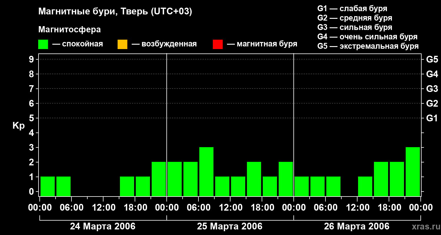 Изменения геомагнитного индекса Kp с 24 по 26 марта 2006 года для средних широт