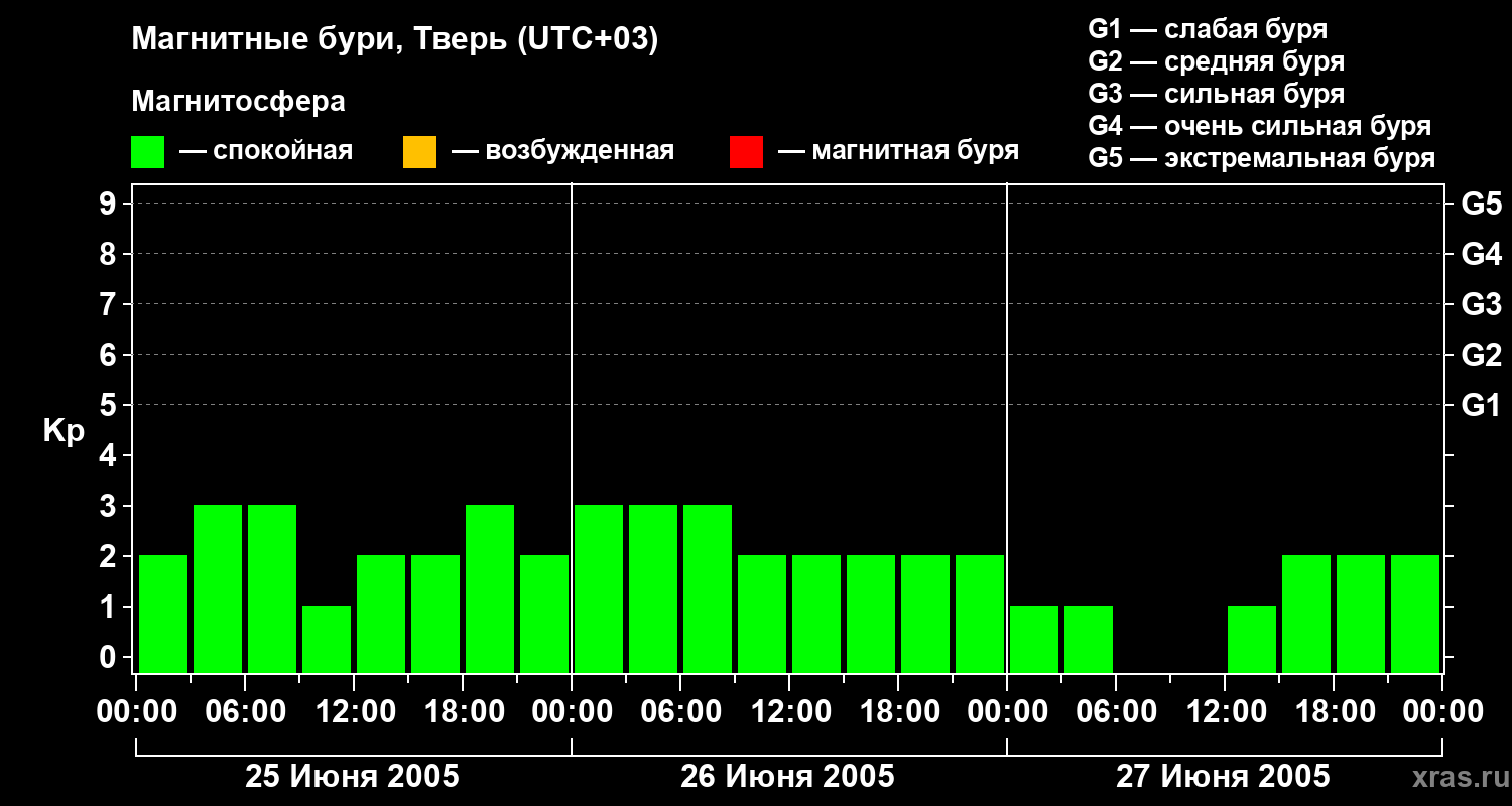 Изменения геомагнитного индекса Kp с 25 по 27 июня 2005 года для средних широт