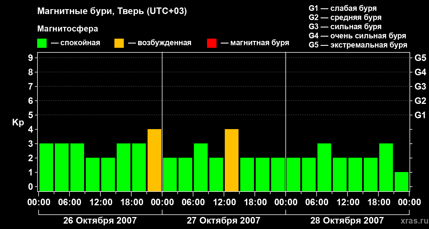 Изменения геомагнитного индекса Kp с 26 по 28 октября 2007 года для средних широт