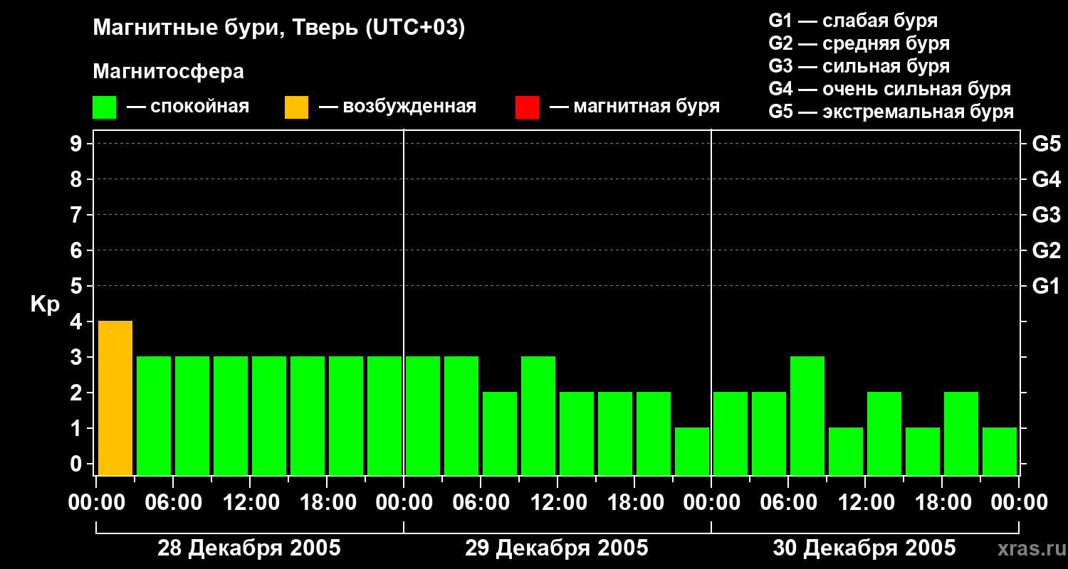 Изменения геомагнитного индекса Kp с 28 по 30 декабря 2005 года для средних широт