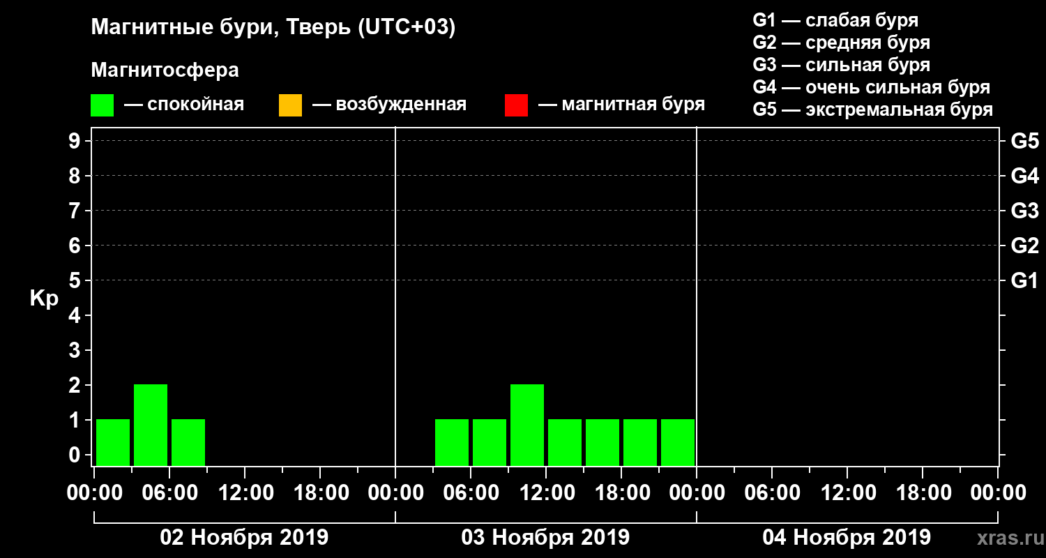Изменения геомагнитного индекса Kp с 2 по 4 ноября 2019 года для средних широт