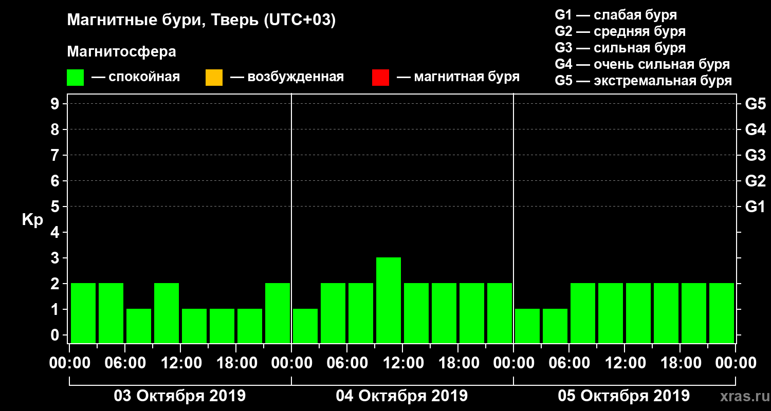 Изменения геомагнитного индекса Kp с 3 по 5 октября 2019 года для средних широт