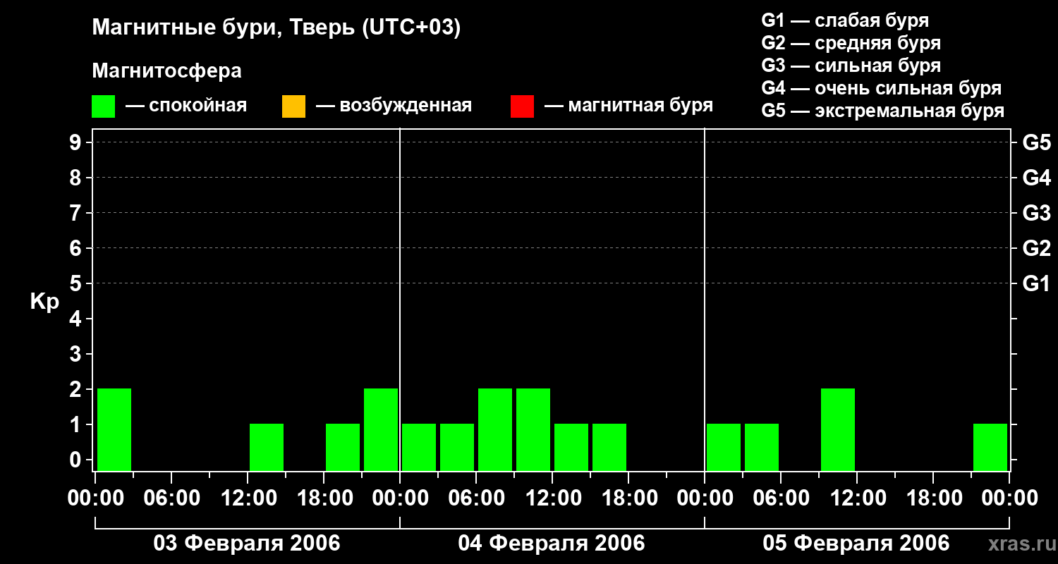 Изменения геомагнитного индекса Kp с 3 по 5 февраля 2006 года для средних широт
