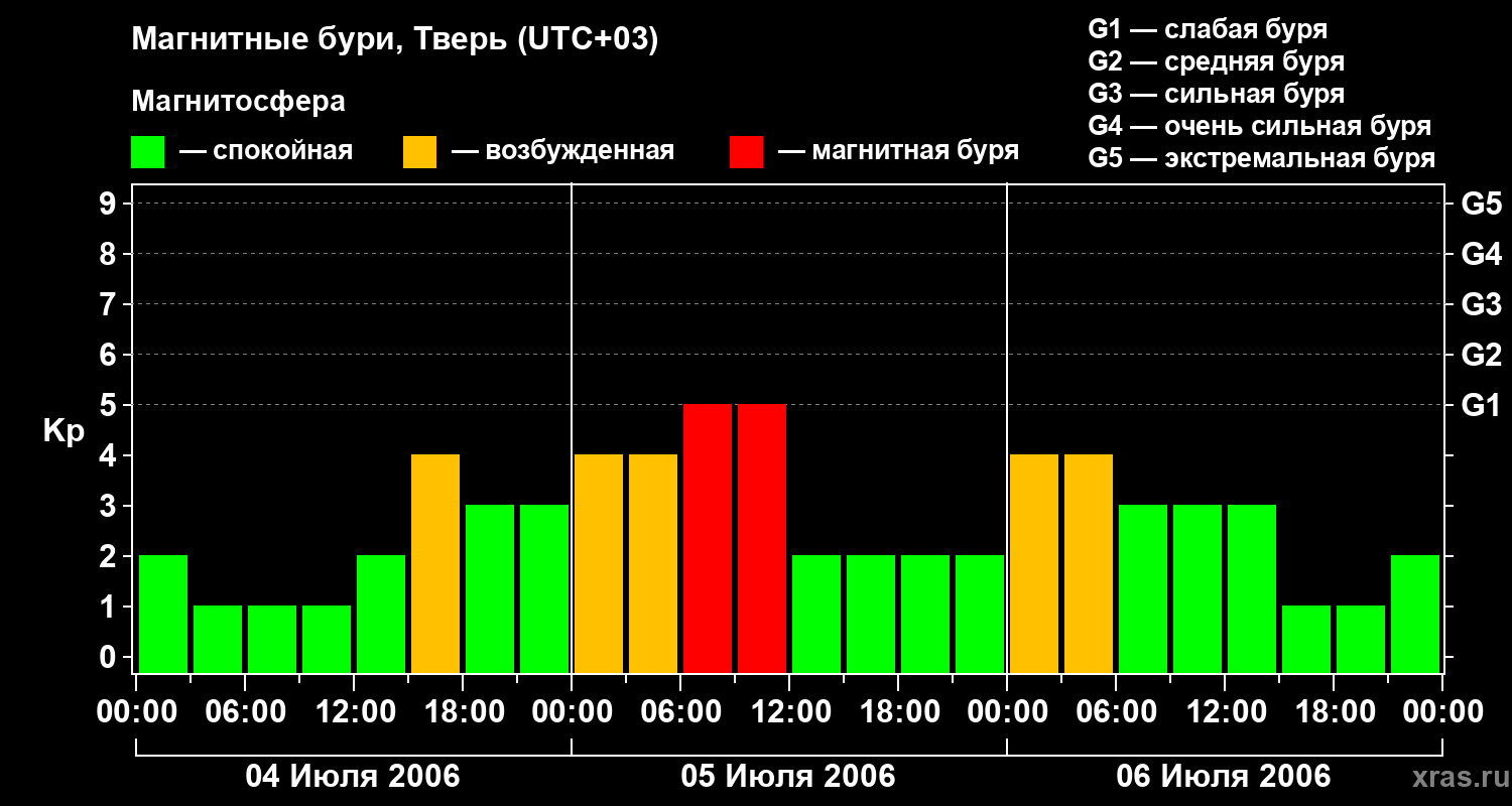 Изменения геомагнитного индекса Kp с 4 по 6 июля 2006 года для средних широт